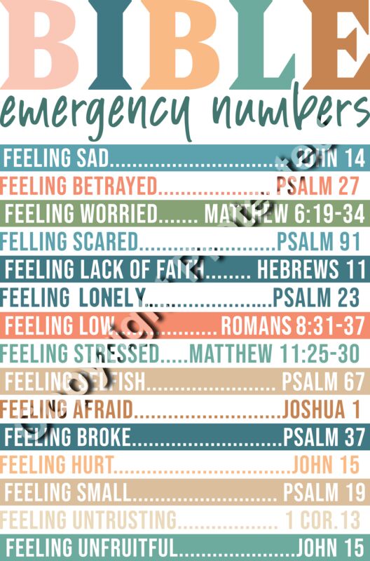 This inspirational design features a list of "Bible Emergency Numbers" for quick reference during difficult times. Each line corresponds to a different emotion or challenge—like feeling sad, betrayed, worried, or scared—with a matching Bible verse to turn to for guidance and comfort. The design uses a colorful palette with bold and clear text, making it both eye-catching and meaningful. Ideal for t-shirts, tote bags, mugs, or wall art, this design serves as a daily reminder of the strength and peace found in Scripture. Perfect for anyone seeking spiritual encouragement or looking to share their faith.
