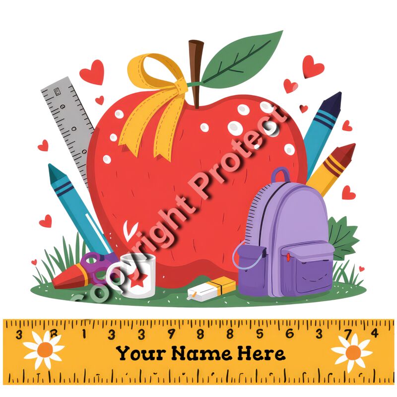 Start the school year off right with our "Custom Back-to-School Apple" design. This charming design features a large red apple surrounded by school essentials like crayons, a ruler, a backpack, and more. The design includes a customizable name banner at the bottom, making it perfect for teachers, students, or school staff who want to add a personal touch to their supplies or apparel. Ideal for a variety of items, this design adds a colorful and personalized touch to your back-to-school collection. Key Features: Customizable Name Banner: The "Custom Back-to-School Apple" design allows you to add any name, making it a perfect personalized item for school gear, clothing, or gifts. Bright and Cheerful Design: The colorful school-themed elements create a fun and inviting look, perfect for celebrating the start of a new school year. Explore our "Custom Back-to-School Apple" design today and create personalized items that will make any student or teacher feel special. Perfect for personal use, gifts, or adding a custom option to your product offerings, this design is sure to be a favorite for the back-to-school season.