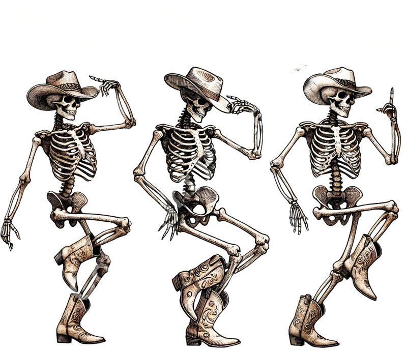 Introducing our "Dancing Cowboy Skeletons" design, a perfect blend of Western flair and Halloween fun! This unique graphic features three lively skeletons dressed in cowboy hats and boots, striking various dance poses under a sky filled with flying bats. The intricate details of the cowboy gear paired with the spooky skeletons create a design that’s both eerie and entertaining—ideal for anyone who loves a good mix of country and creepy. Available Options: T-Shirts: Add some spooky country style to your wardrobe with our "Dancing Cowboy Skeletons" t-shirt. Made from soft, durable cotton, this shirt is perfect for Halloween parties, country music festivals, or any occasion where you want to show off your love for both Western and spooky themes. Crewneck Sweatshirts: Stay warm and stylish with our "Dancing Cowboy Skeletons" crewneck sweatshirt. Perfect for those cool fall nights, this cozy sweatshirt combines comfort with a playful Halloween twist, making it a great choice for October outings or cozying up by the campfire. DIY Transfers: For those who enjoy customizing their own apparel, our "Dancing Cowboy Skeletons" screen print transfer is an excellent option. Easily apply this fun and festive design to t-shirts, hoodies, tote bags, or any other fabric item you want to personalize with a touch of spooky Western charm. Whether you're two-stepping your way through a Halloween party or just love the idea of a spooky rodeo, our "Dancing Cowboy Skeletons" design is the perfect way to celebrate the season with a bit of country style. Get ready to boot-scoot into the Halloween spirit with this fun and unique design!