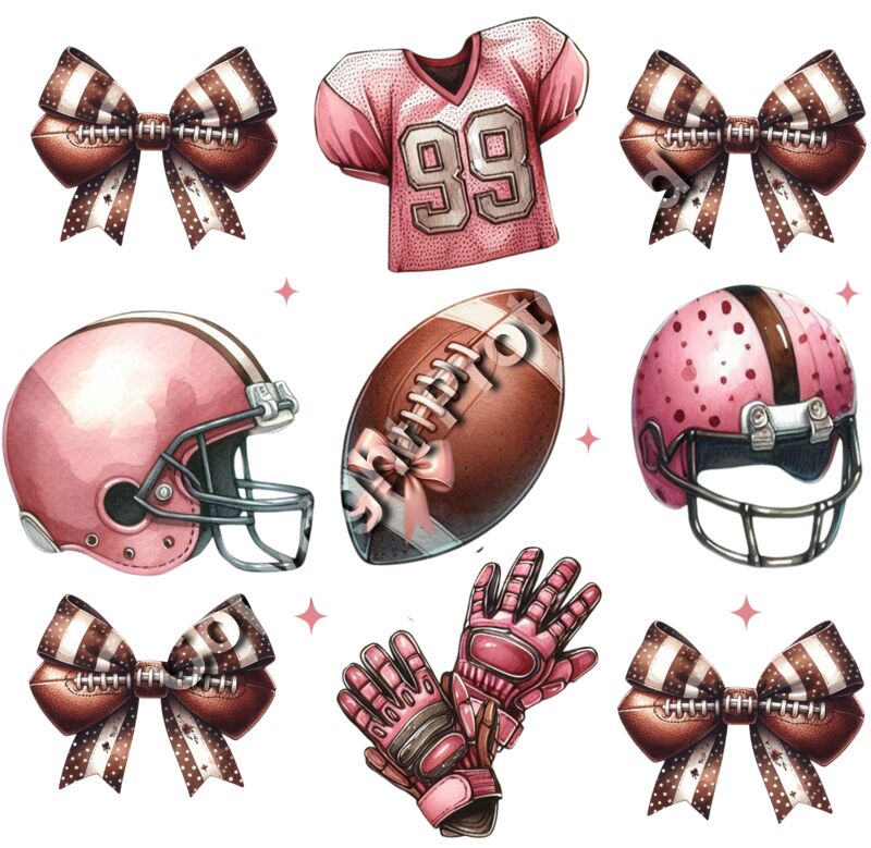 Introducing our "Football Fanatic" perfect for adding a touch of sporty style to your apparel and accessories. This design features a collection of football-themed elements, including helmets, jerseys, bows, gloves, and a football—all beautifully detailed in shades of pink and brown with charming accents like bows and polka dots. These designs are perfect for showing off your love for the game in a fun and feminine way. Design Details: Versatile Elements: This offers multiple football-themed graphics, perfect for mix-and-match creativity. Whether you’re decorating a t-shirt, hoodie, or any other item, these designs are ideal for achieving a cohesive and stylish look. Unique Pink Theme: The soft pink and brown color scheme gives a fresh, stylish twist to traditional football designs, making it perfect for female fans or anyone who loves to add a pop of color to their game day apparel. Perfect For: T-Shirts: Customize your own game day shirt with these fun and feminine football graphics. Whether you’re cheering from the stands or hanging out with friends, these designs will make your outfit stand out. Crewneck Sweatshirts: Add these elements to your cozy crewnecks for a stylish and sporty look that’s perfect for cooler weather. The mix of designs allows for endless possibilities when it comes to placement and creativity. DIY Transfers: If you enjoy creating your own apparel, these transfers are easy to use. Apply them to your favorite clothing items, tote bags, or even pillows to bring a sporty, stylish flair to any project. Celebrate your love for football with this unique "Football Fanatic" design, perfect for game day and beyond. Whether you’re creating a DIY project or looking for ready-made options, this design brings together the best of football with a feminine touch.
