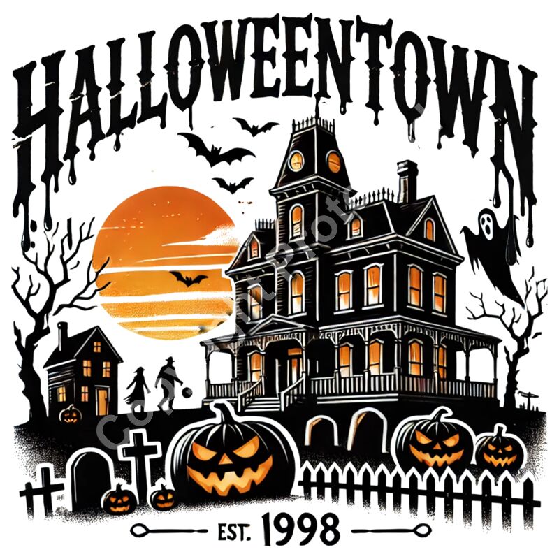 Introducing our "Halloweentown" design, perfect for fans of spooky season and classic Halloween vibes! This detailed and nostalgic design features a haunted mansion with glowing windows, eerie jack-o'-lanterns, and a full moon casting an orange glow over the scene. The gothic lettering and vintage aesthetic transport you straight to Halloweentown, established in 1998, making it a must-have for anyone who loves the magic and mystery of Halloween. Available Options: T-Shirts: Celebrate Halloween in style with our "Halloweentown" t-shirt. Made from soft, durable cotton, this shirt is perfect for trick-or-treating, Halloween parties, or just showing your spooky spirit throughout the season. The intricate design stands out beautifully against a black background, making it a standout piece in your wardrobe. Crewneck Sweatshirts: Stay cozy on cool autumn nights with our "Halloweentown" crewneck sweatshirt. Crafted from premium fleece fabric, this sweatshirt offers warmth and comfort while showcasing a classic Halloween design that captures the essence of the season. DIY Transfers: For those who love creating their own Halloween apparel, our "Halloweentown" screen print transfer is an excellent choice. Easy to apply with a heat press, this transfer lets you add the iconic Halloweentown scene to your favorite garments, tote bags, or home decor items. Whether you're reliving the nostalgia of Halloween classics or simply love the eerie charm of haunted houses and jack-o'-lanterns, our "Halloweentown" design is the perfect way to celebrate the season. Get yours today and step into a world of spooky fun!