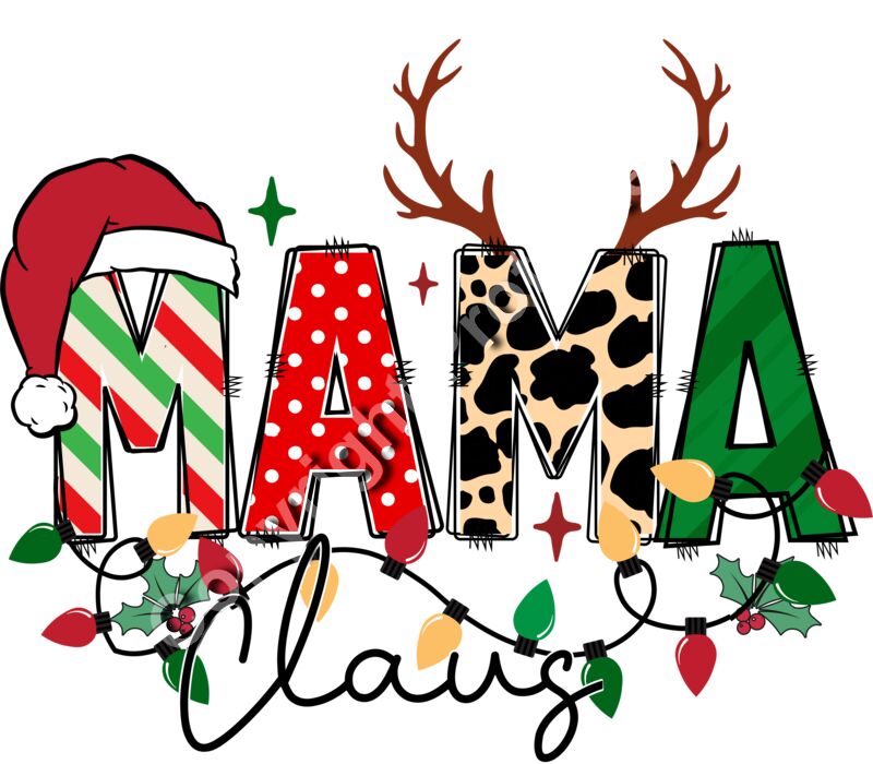 Celebrate the holidays in style with our “Mama Claus” DTF transfer, perfect for the festive matriarch! This playful design features the word “MAMA” in bold letters, each with a unique holiday pattern, from candy cane stripes to polka dots and leopard print, topped with a Santa hat, reindeer antlers, and colorful Christmas lights. The elegant “Claus” script below adds a whimsical touch, making this design ideal for hoodies, crewnecks, or T-shirts. It pairs perfectly with our hearts sleeve print (sold separately), adding an extra touch of love to your holiday ensemble. Embrace the season with this fun and stylish look that’s sure to make “Mama” the star of the season!
