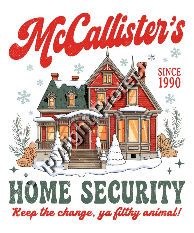 McCallister’s Home Security is a cozy, vintage holiday design available only as a physical product. Choose your format at checkout, including DTF transfer, UV DTF sticker, finished apparel, tote or pillow cover, mug or tumbler wrap, or a ready-to-frame print. No artwork files are provided, no digital download.