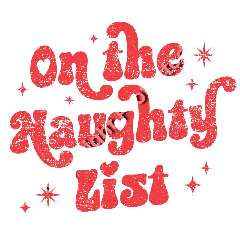 On the Naughty List – Retro Christmas DTF Transfer Bring some playful holiday attitude to your next print with this On the Naughty List design. Featuring bold retro lettering, distressed red texture, and sparkly vintage star accents, this design is perfect for customers who love cheeky Christmas style with a nostalgic twist. Printed in full color and ready to press, this DTF transfer looks amazing on cozy crewnecks, tees, and hoodies. Great for boutique holiday drops, festive photo shoots, and fun Christmas party outfits.
