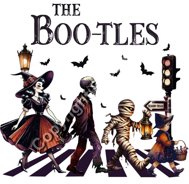 Celebrate Halloween with a playful twist on a classic album cover in our "The Boo-tles: Scabby Road" design. Featuring a lineup of spooky characters—a witch, a skeleton, a mummy, and a little witch—all crossing a haunted crosswalk under the eerie glow of streetlights, this design is both nostalgic and fun. The clever play on words and detailed artwork make it a perfect piece for Halloween enthusiasts and music lovers alike. Ideal for various apparel and accessories, this design adds a unique and festive touch to your collection. #### Key Features: - **Nostalgic and Festive Design:** The "The Boo-tles: Scabby Road" illustration is a whimsical homage to a classic album, reimagined with Halloween flair. The spooky characters and eerie setting make this design both memorable and fun. - **High-Quality Print:** Our design ensures excellent color vibrancy and durability, maintaining its charm and detail even after multiple washes. Explore our "The Boo-tles: Scabby Road" design today and bring a touch of musical nostalgia and Halloween fun to your custom apparel projects. Perfect for personal use, gifts, or adding a unique and playful statement piece to your product offerings, this design is sure to be a hit with fans of both music and Halloween.