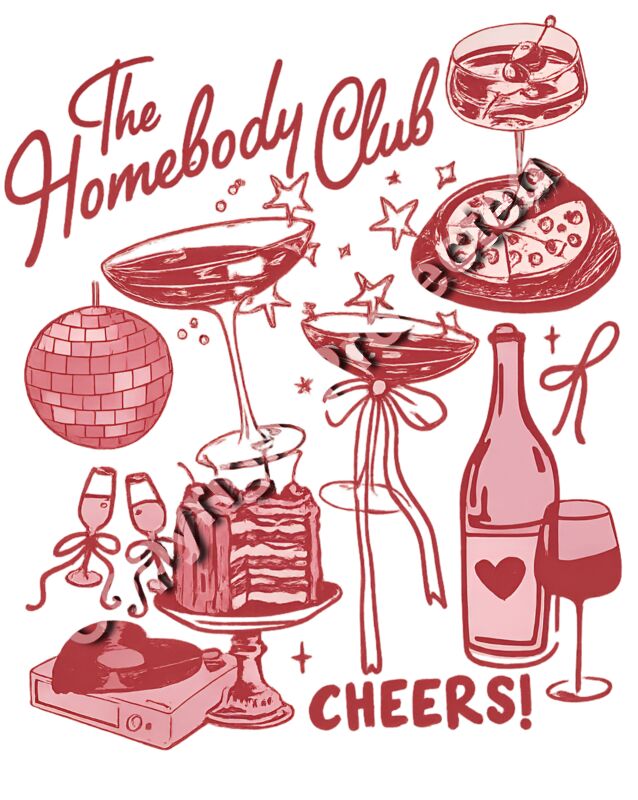 Why go out when you can celebrate in style from the comfort of home? Our Homebody Club DTF transfer or finished apparel is perfect for cozy nights in with wine, cocktails, pizza, music, and good vibes. This hand-drawn retro-style design features disco balls, martinis, champagne, cake, vinyl records, and the motto “CHEERS!” – the ultimate tribute to staying in and living it up. ✨ Available As: High-quality DTF transfer (press on your own blanks) Finished t-shirt, hoodie, or crewneck (professionally pressed & ready to wear) 🍷 Perfect For: Wine lovers & cocktail enthusiasts Girls’ night in or weekend lounging Fun gifts for homebodies and introverts Cozy, casual outfits with a retro twist 🖤 Why You’ll Love It: Vibrant & durable DTF print, easy to press Works on cotton, poly, and blends Professionally pressed apparel option for soft, lasting wear If you’re searching for homebody shirts, wine lover apparel, cocktail party graphic tees, retro cozy sweatshirts, or unique DTF transfers for introverts, this design is the perfect fit.